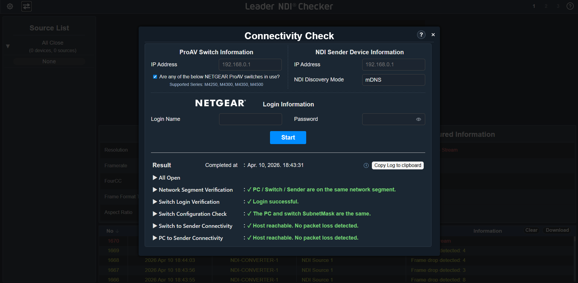 NDI Checker intègre désormais la fonction « Connectivity Check », qui vous permet de vérifier plus facilement si votre PC parvient à communiquer correctement avec les périphériques nécessaires au fonctionnement du protocole NDI. Cela vous aide à détecter rapidement les problèmes réseau courants, tels que des paramètres IP incorrects, des périphériques inaccessibles ou des difficultés de connexion aux commutateurs, avant qu'ils ne perturbent votre flux de travail. Grâce à « Connectivity Check », vous pouvez identifier les points de défaillance de la communication et intervenir plus efficacement lors de la configuration et du dépannage.